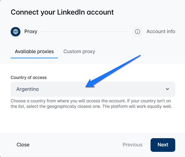 - When connecting LinkedIn, choose a proxy location that matches where you normally access LinkedIn. This keeps everything smooth and consistent.