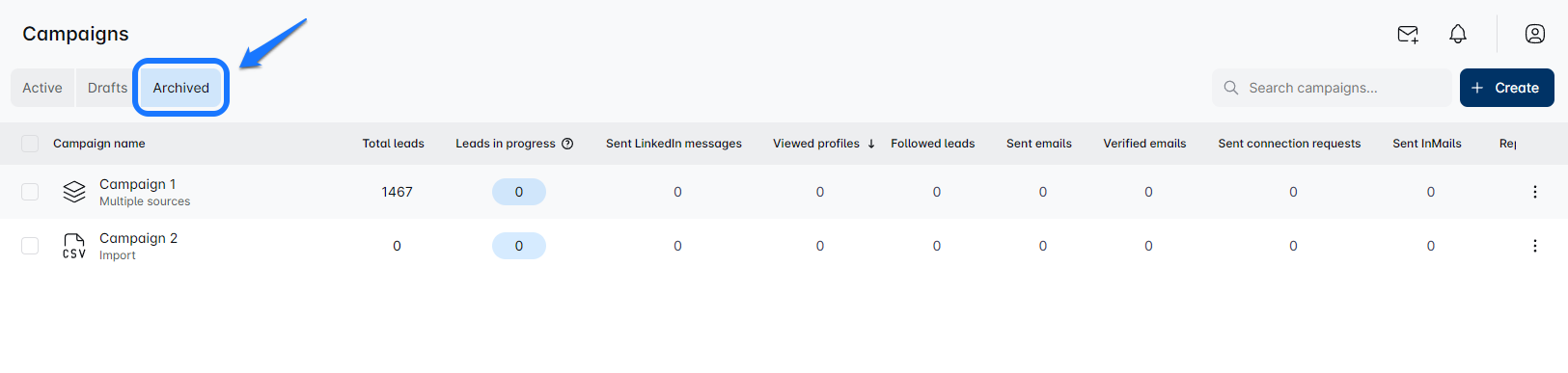 Simply switch to the 'Archive Campaigns' view. Youโll now see all your neatly tucked-away campaigns.