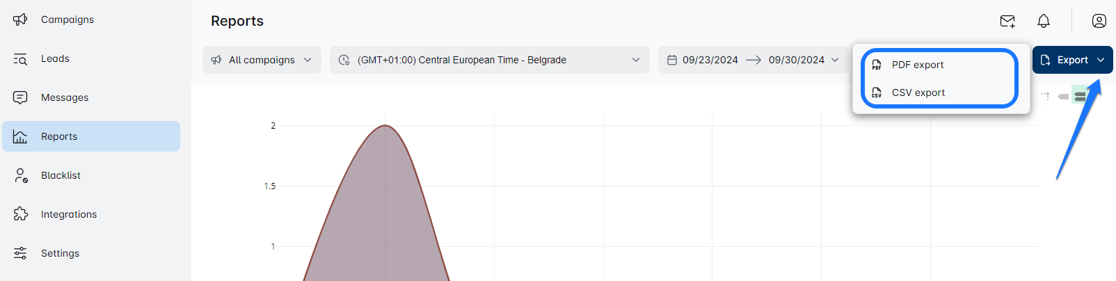 - This option can be reached from the Leads section on the left side menu. It allows you to export data from all your campaigns at once.