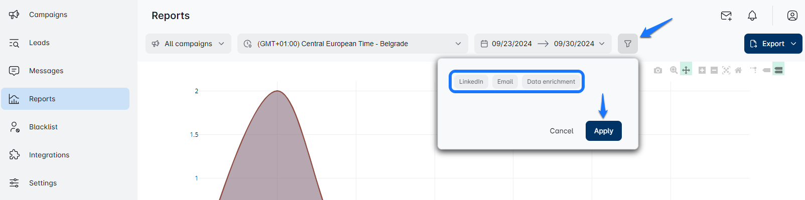 You can access the reports page of a particular campaign from your leads list page and apply specific filters like just data from LinkedIn or email, or data enrichment.