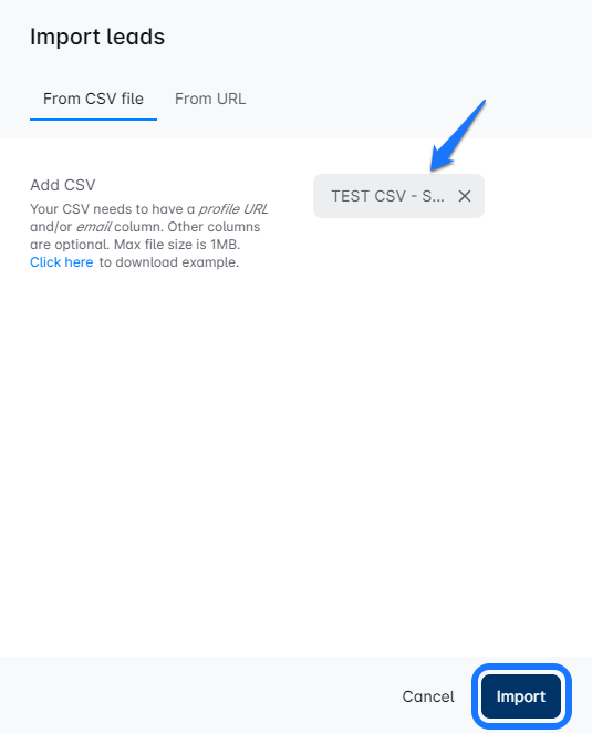Click on the name of the campaign you want to expand. This will take you to the Leads List page, where youโll find a shiny button that says โImportโ Click it, and upload your CSV file filled with fresh leads, or opt for adding a Search URL.